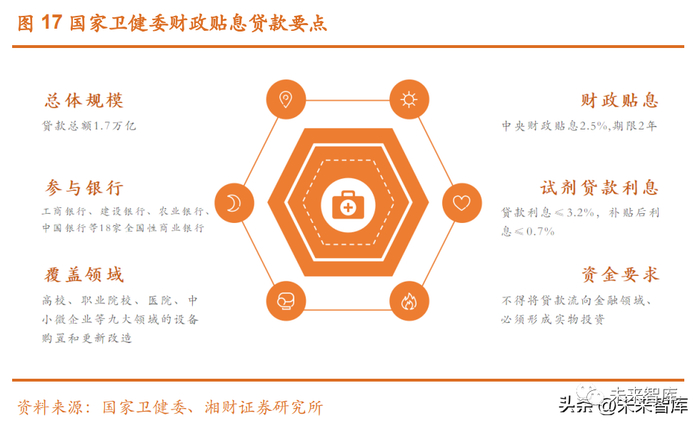 9 月 15 日卫健委下发拟使用财政贴息贷款更新医疗设备的通知,根据迈 瑞医疗投资者交流信息,目前,从已了解的情况来看,卫健委规划司及其他 相关部门正在协商政策具体细则,预计将覆盖公立和非公立医疗机构,每家医院贷款金额不低于 2000 万。贷款使用方向包括诊疗、临床检验、重症、康 复、科研转化等各类医疗设备购臵。按照浙江、江苏、安徽三省的上报情况, 十一黄金周期间已上报约 180 亿元的设备采购需求。以此类推,全国医疗设 备采购将涌现出数千亿级需求,医疗新基建有望持续发力,同时民营医疗机 构也有望借此机会提升医疗设备配臵水平。