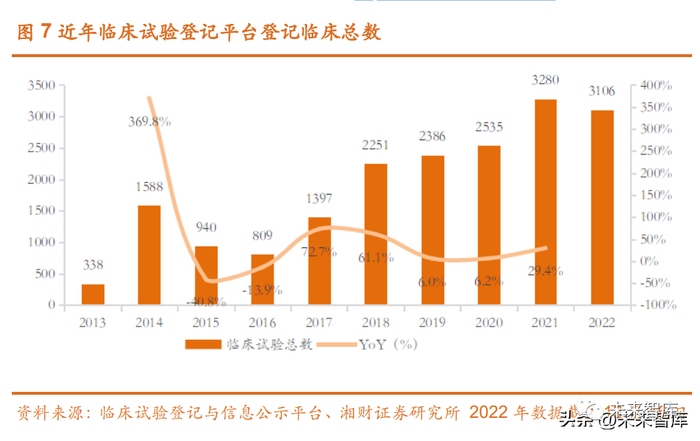 我们认为,医药工业营收及 净利润持续稳健增长将成为医药创新投入的重要支撑,在全行业研发投入年 均增长 10%以上的目标之下,预计医药工业企业对医药研发投入的积极性将 继续高涨,从而有利于创新产业链相关公司发展。此外,随着供需两端利好 创新药企业,国内医药企业近年来愈发注重研发创新,研发投入呈现高速增 长态势。随着越来越多的企业加入中国医药研发大军,越来越多的创新药从 临床前走进临床,2021 年临床登记数再创新高,达 3280 件,截至 2022 年 12 月 16 日临床试验登记数达到 3106 件,继续保持较高水平。