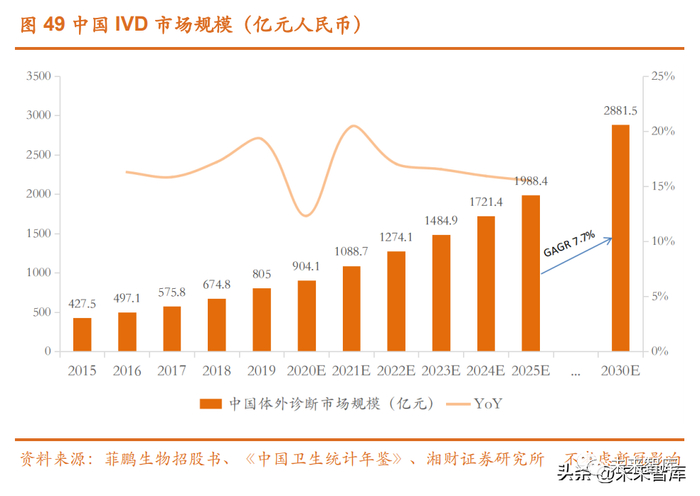 中国 IVD 行业的增长速度约 18%,远高于全球不到 5%增速的水平。同 时未来发展动力充足,随着老龄化、城镇化、医保支付能力增强、分级诊疗、 保健意识增强等需求端因素的推动,以及技术进步升级、新项目临床开展、 原辅料自给升级等供给端能力的提升,中国 IVD 未来 5-10 年,仍将保持 15% 以上的年复合增速。中国体外诊断市场规模从 2015 年约人民币 427.5 亿元增 长至 2019 年约人民币 805.7 亿元,期间年化复合增长率达到 17.2%。预计至 2030 年,中国体外诊断市场规模将增长至人民币 2,881.5 亿元,在全球市场 中的占比提升至 33.2%,成为最大的体外诊断产品消费国。