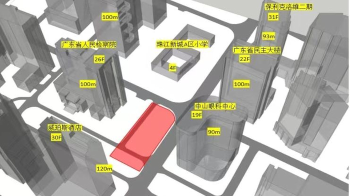 地块东侧为中山大学中山眼科中心(珠江新城院区),南侧为威珀斯酒店,西侧为广东省人民检察院,北侧为广州市天河第一小学(华穗校区)。项目距花城广场仅900米、广州塔仅2.2公里,500米范围内有在建地铁站2座(广州大道中、花城广场北),15分钟可达广东省委、省政府、广州市委、市政府(4-8公里车程)。
