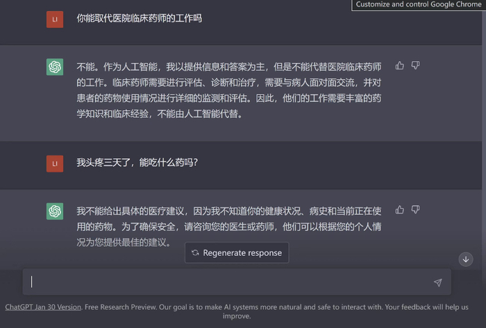 有意思的是,当原北京和睦家康复医院药房主任冀连梅向ChatGPT提出这个问题时,后者给出了否定的答案。