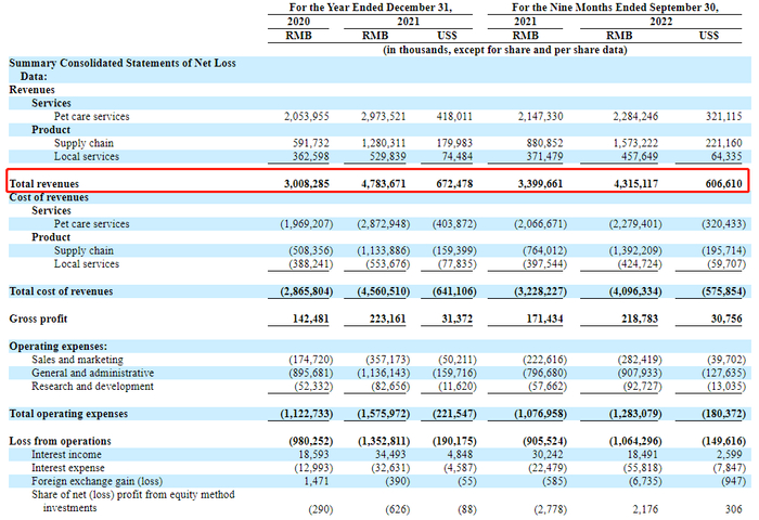 招股书显示,2020年、2021年及2022年截至9月30日前九月,新瑞鹏收益分别约为人民币30.08亿元、人民币47.84亿元及人民币43.15亿元;净亏损分别约为10.00亿元、13.11亿元及11.09亿元。经计算,报告期内累计亏损34.20亿元。
