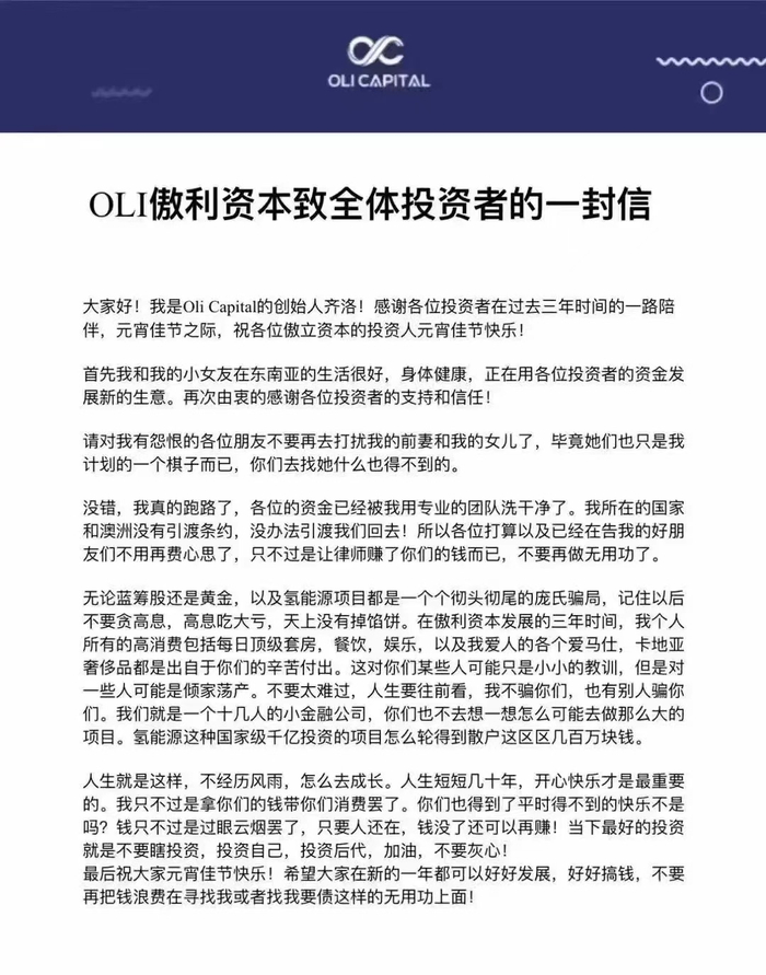 这家公司为傲利资本(Oli Capital),创始人齐洛在致投资者的一封信中公开宣布“没错,我真的跑路了。钱早就洗干净了,我们人都到国外了,这是给你们投资人的一个教训,不经历风雨怎么成长”,