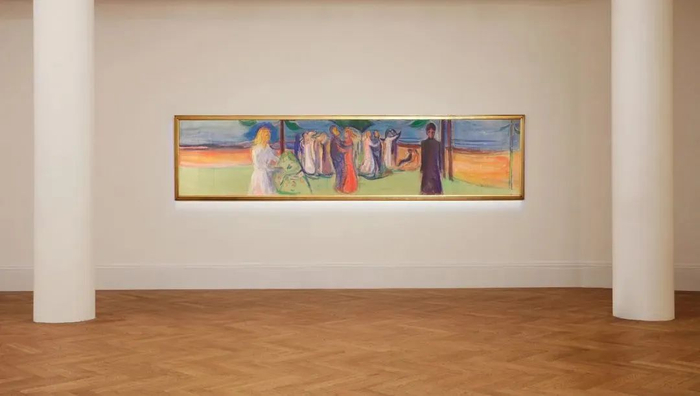 其中,《在海滩起舞》的是莱因哈特横饰壁画系列的代表作,尺幅达四米多宽。画作探索孟克众多主要主题,前景中是两位他曾经深爱的女子,而这两段恋情都换来了心碎的结局。
