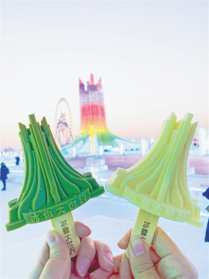 哈尔滨冰雪大世界携手中华老字号马迭尔推出了定制文创雪糕,迅速成为了游客游玩打卡的必备拍照神器。雪糕有主塔“冰雪之冠”和雪花摩天轮两款造型,牛奶、抹茶、芒果、草莓四种口味。造型逼真、线条细腻的文创雪糕,堪称雪糕界的绝美雕塑,轻轻咬上一口,吃下去的不止是雪糕,更是沉淀60年的现代冰雪艺术。