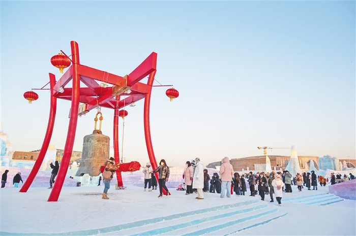 “金色中国心”的主题景观为“世纪之钟”。作为哈尔滨冰雪大世界传承24年唯一保留下来的非冰景观,“世纪之钟”的魅力得到大家公认。敲钟的画面还登上央视荧屏,无论是作为背景打卡,还是亲自上阵敲钟,都能留下最美的画面。