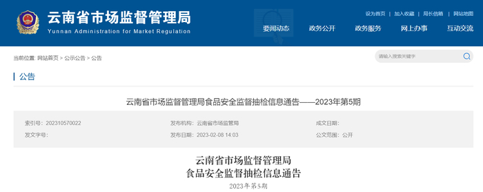 中国质量新闻网讯 2023年2月8日,云南省市场监督管理局网站发布2023年第5期食品安全监督抽检信息。本期抽检粮食加工品、肉制品、乳制品、速冻食品、酒类、蔬菜制品、糕点、餐饮食品、食用农产品9个大类572批次样品,12批次样品不合格、560批次样品合格。合格样品信息见下表。