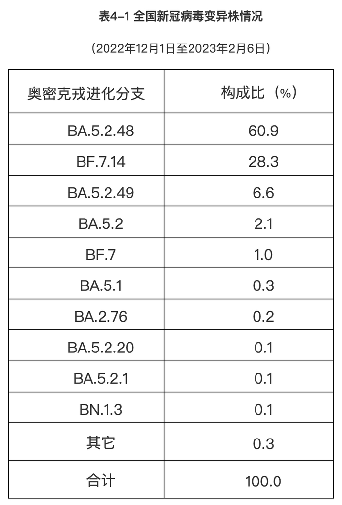 2022年12月1日至2023年2月6日,全国共报送14515例本土病例新冠病毒基因组有效序列,全部为奥密克戎变异株,共存在31个进化分支。主要流行株为BA.5.2.48(60.9%)和BF.7.14(28.3%)。共发现重点关注变异株13例,其中,1例XBB.1,5例BQ.1.1,1例BQ.1.1.17,4例BQ.1.2和2例BQ.1.8。