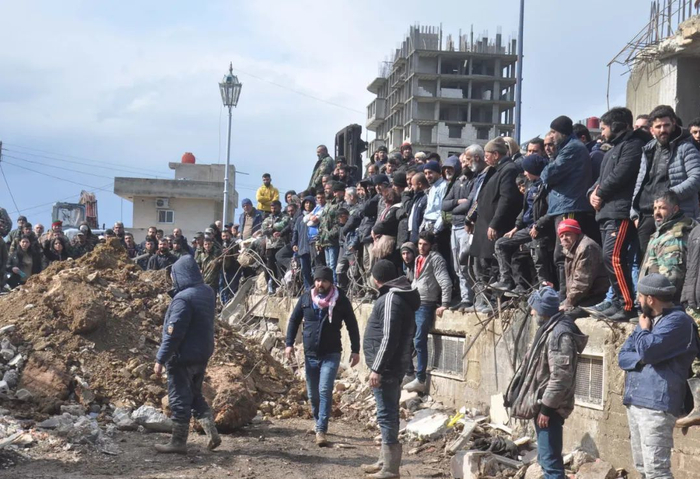 2月7日,人们聚集在叙利亚拉塔基亚省的一处地震废墟。新华社发