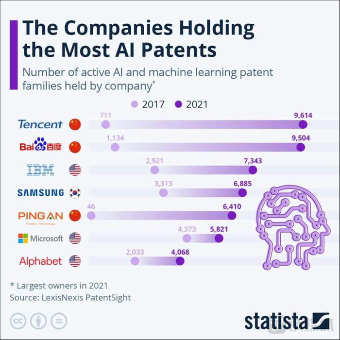 根据数据研究机构Statista近日公布的2021年 AI 技术专利排名中,腾讯位列第一,第二是百度,超过了微软、谷歌等硅谷科技巨头。