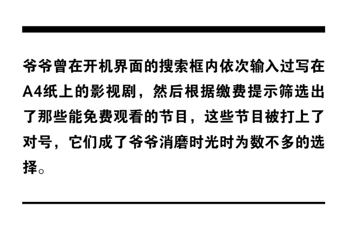 王女士的爷爷今年虚岁81岁,他年轻时上过军校,退休前是一名数学教师。但就是在这样的教育背景加持下,面对需要处处缴费的电视机,爷爷仍显得力不从心。一方面,他不擅长网络缴费,另一方面,他也不能理解为什么交了钱的电视还要再次缴纳费用,用来记录影视剧的三张A4纸成了他筛选电视节目的依据。王女士介绍,爷爷曾在开机界面的搜索框内依次输入过写在A4纸上的影视剧,然后根据缴费提示筛选出了那些能免费观看的节目,这些节目被打上了记号,它们成了爷爷消磨时光时为数不多的选择。