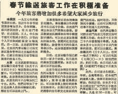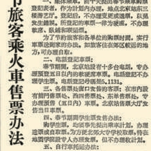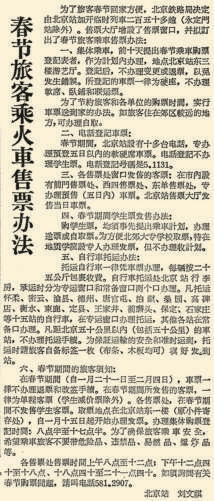 据本报1953年2月9日1版《合理组织春节客运保证货运装车》报道,当年春节是2月14日,北京铁路管理局用了12天时间送出旅客13万人,另有17万人要在一周之内离京,非常困难。无奈之下,北京铁路管理局发出紧急通告,请求旅客们如果没有特别要紧的事,最好改期迟走。