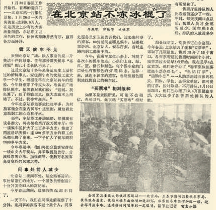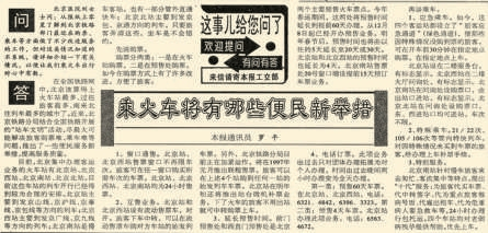 1983年春运期间,通过永定门火车站的列车几乎趟趟超员。列车员无法进行正常服务,连送开水都要采取“跳障碍”或“接力”的办法,极平常的一碗开水成了旅客的宝贝。发现这种情况后,永定门火车站专门抽出工作人员,经由列车一靠站,便把开水递送到一路唇干舌燥的旅客面前,解决了他们的“燃嗓”之急。(1983年2月26日《北京日报》1版,《这种“小角度”改革也很好》)