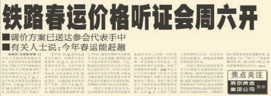 半个月后,听证会有了结果:春运期间,运输能力紧张线路的部分旅客列车,在客流高峰期票价适当上浮,其中软席票价最高可上浮35%,硬卧票价最高可上浮25%,硬座车厢票价最高可上浮15%。(2002年1月28日《北京日报》5版,《春运票价调整方案公布》)
