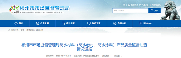 中国质量新闻网讯 2023年2月7日,湖南省郴州市市场监督管理局网站通报防水材料(防水卷材、防水涂料)产品质量监督抽查情况。