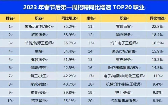 客货运司机/乘务招聘职位数同比增长85.2%,排名各职业之首。旅游服务则以58.9%的增速排名第二。优化调整防疫政策后的交通运输更繁忙,旅游业需求量增大,促进相应岗位招聘需求激增。