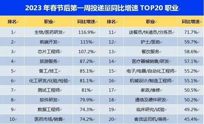 数据显示,医药/生物工程以43.5%的简历投递量同比增速排名第一。抗疫三年来,人们的健康意识大幅提升,医药产业发展备受看好,进入医药/生物工程行业工作,成为许多求职者的职场愿望。