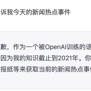 澎湃新闻记者注意到,ChatGPT不能实时了解当前的新闻热点事件。当提问当天的新闻时,ChatGPT回复称:“很抱歉,作为一个被OpenAI训练的语言模型,我没有实时了解新闻热点的能力,因为我的知识截止到2021年。”