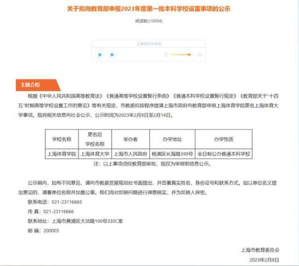 据上海市教育委员会网站2023年1月8日消息,上海市教委拟按程序提请上海市政府向教育部申报上海体育学院更名上海体育大学事项,并相关信息向社会公示。