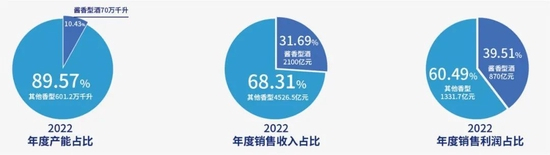 2022年,中国酱酒产能约70万千升,同比增长16.7%,约占我国白酒总产量671.2万千升的10.43%;实现销售收入2100亿元,同比增长10.5%,约占我国白酒总销售收入6626.5亿元的31.69%;实现利润约870亿元,同比增长11.5%,约占我国白酒总利润2201.7亿元的39.51%。