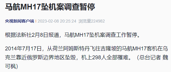 根据法新社2月8日报道,马航MH17坠机案调查工作暂停。
