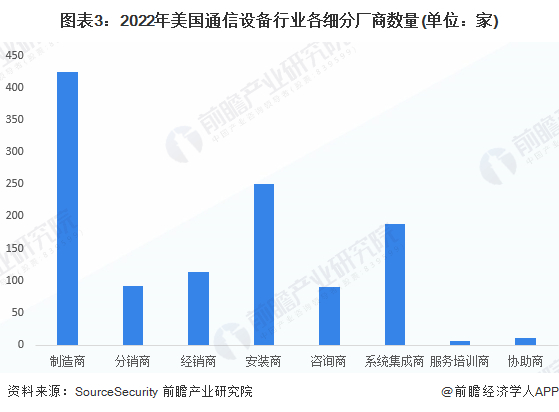 美国通信设备行业主要包括无线电和电视广播设备,具体产品包括天线、机顶盒、GPS 系统、手机、卫星上行链路技术以及无线电和电视广播设备。根据SourceSecurity的数据,2022年美国通信设备行业中通信设备制造商数量较多,为424家,其次为通信设备安装商,数量为251家,系统集成商数量为188家。