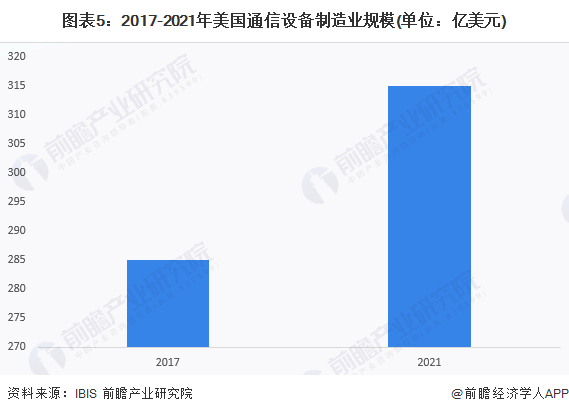 随着经济增长和消费者需求的刺激,美国通信设备需求呈不断上升趋势,但市场规模增长速度相对缓慢,通信设备制造多迁至离岸制造国,如墨西哥、加拿大、中国等,2021年,根据IBIS的数据,美国通信设备制造业规模达到315亿美元。