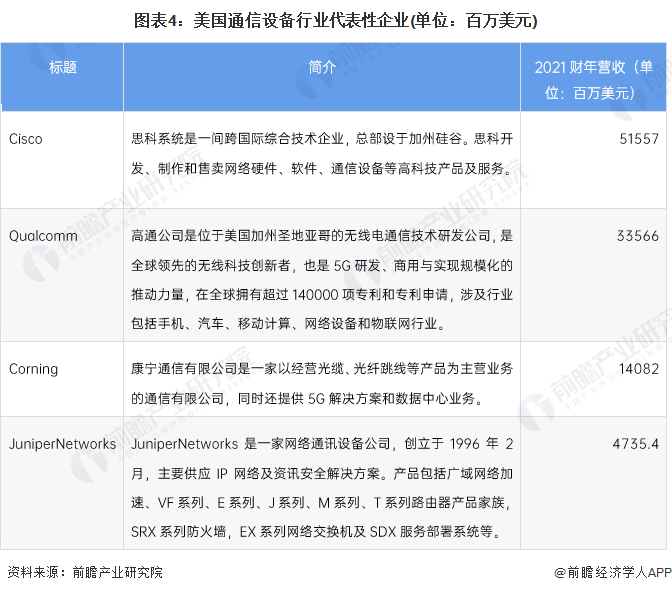 美国通信设备的代表性企业包括思科、高通、康宁等企业,其中思科作为美国通信设备制造的重要企业,于1984年成立,在21世纪初陆续全球范围内的扩张,接连收购以色列软件商 Intucell、英国无线技术供应商 Ubiquisys、网络信息安全商Sourcefire、典网络软件制造商Tail-f Systems、云端物联网服务平台Jasper等,陆续进入人工智能、光学芯片、5G网络等领域,企业营收规模不断扩大,2021财年营收规模为515.57亿美元。