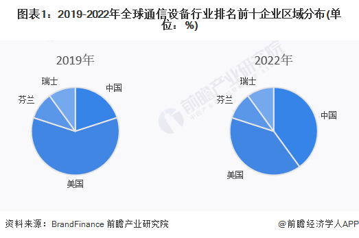 1973年,美国摩托罗拉公司发明首部商用手机,美国通讯开始走向商用,1986年,第一代移动通讯系统(1G)在美国芝加哥诞生,采用模拟讯号传输。2003年,美国Verizon Wireless开通CDMA2000网络,美国3G开始商用。2010年,Verizon Wireless首先在美东北部开始正式商用FDD LTE网络,美国4G开始商用。由于无线电信网络的快速发展,美国在全球范围内占据较大的通信市场份额。美国先进电信网络技术进一步加速了电信设备的采用,远程工作和企业移动性的增长趋势带动了高速通信基础设施的建设。美国通讯制造业务规模一度全球领先,在BrandFinance发布的通信设备制造前十企业排名中,2019年美国企业占比60%,到2021年,在中国等通讯设备制造厂商规模不断扩大的影响下,该数据下降至40%。