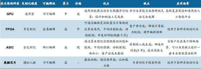 ASIC/DPU等专用芯片在特定使用场景下高算力/低功耗/小面积的优势仍吸引国内外厂商积极布局,如TPU、类脑芯片等;FPGA由于可编程而更具灵活性,相比于CPU/GPU/ASIC具有更高的速度和极低的计算能耗,常年来被用作专用芯片的小批量替代品。