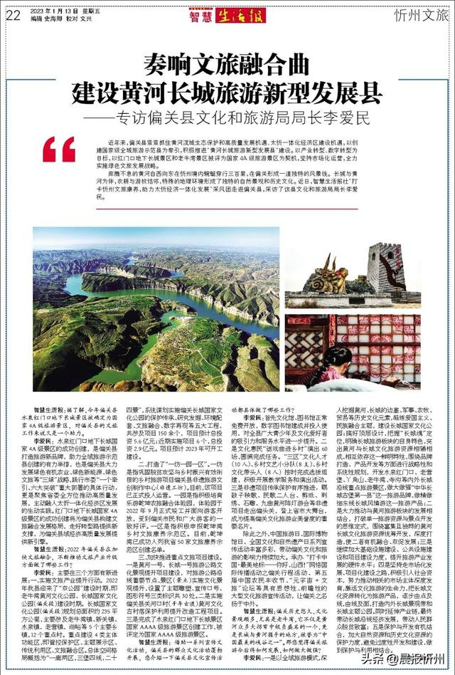 奔腾不息的黄河自西向东在忻州境内蜿蜒穿行三百里,在偏关形成一道独特的风景线。长城与黄河为伴,农耕与游牧结邻,特殊的地理环境形成了独特的自然景观和历史文化。近日,《智慧生活报》社“打卡忻州文旅康养,助力太忻经济一体化发展”采风团走进偏关县,该县文化和旅游局局长李爱民接受了记者的专访。
