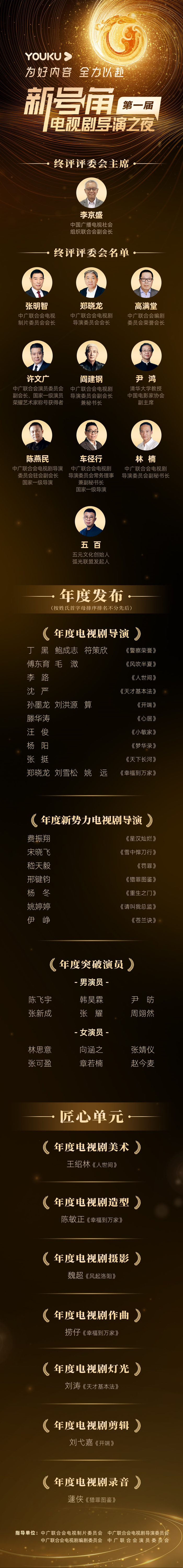 2月8日,由优酷主办,中广联电视制片委员会、电视剧导演委员会、演员委员会、电视剧编剧委员会联合指导的第一届“新号角电视剧导演之夜”在北京举行。活动现场发布10项年度称号,郑晓龙、傅东育、杨阳等24位导演,陈飞宇、张婧仪等12位演员,陈敏正、捞仔等7位幕后主创获得年度称号。导演之夜上,优酷也从内容和技术两方面展示对影视工业化的思考,并发布新策略。