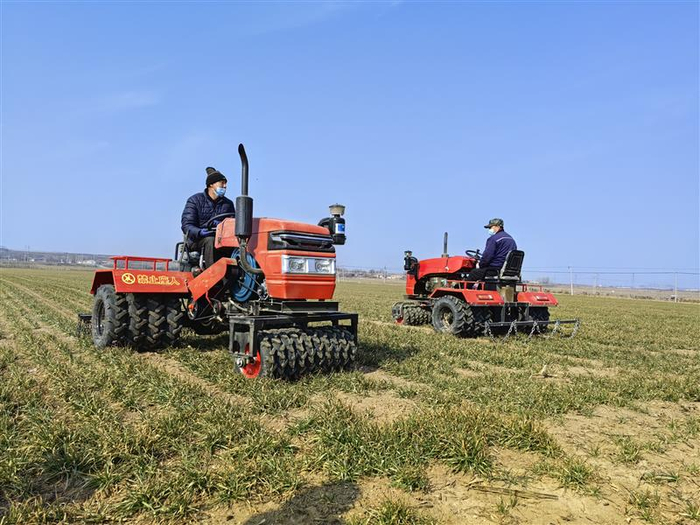 做好春耕备耕生产是确保全年粮食和重要农产品稳定保供的关键。在平度市田庄镇西寨村的麦田里,小麦镇压机正在进行麦田镇压,“去年新购置了多轮式小麦震压机械,既速度快、又效率高,往年震压小麦需要十来天,今年只需5天就能全部完成。”青岛西寨农机专业合作社负责人侯松山说道:“机械震压可以抗旱保苗,又能促弱转壮,控制旺长。”
