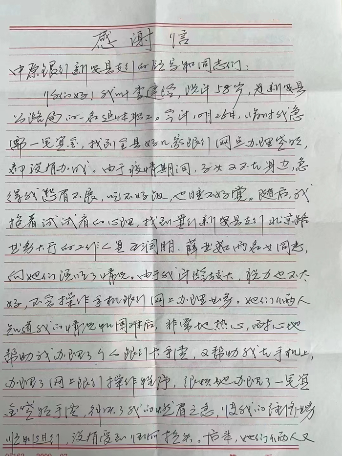 前不久,中原银行新安县支行个人客户经理王润朋、薛亚茹收到了一封手写的客户来信,打开信封,映入眼帘的是两个熟悉的名字,来信人是中原银行的老客户李建玲夫妇。临近春节,李建玲夫妇亟需给在外地的子女汇20万元应急,夫妇两人在中原银行存有定期存款,一个月后才到期,如果提前支取,会损失一笔不少的利息。王润朋和薛亚茹在了解客户的需求后,通过中原银行一点通APP帮助他们申请了纯线上信用贷款“原e贷”,申请、提款、转账等一系列操作,在工作人员的指导下很快就完成了。一个月后,定期存款到期,李建玲夫妇顺利归还了贷款,解决了燃眉之急。