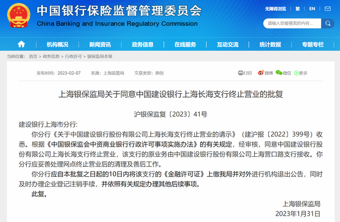 银保监官网批复信息显示,工行上海大统支行原业务由工行上海苏河湾支行接收;工行上海莘庄商务区支行原业务由工行上海七莘路支行接收;建行上海胶州路支行原业务由建行上海江宁路支行接收;建行上海长海支行原业务由建行上海营口路支行接收。