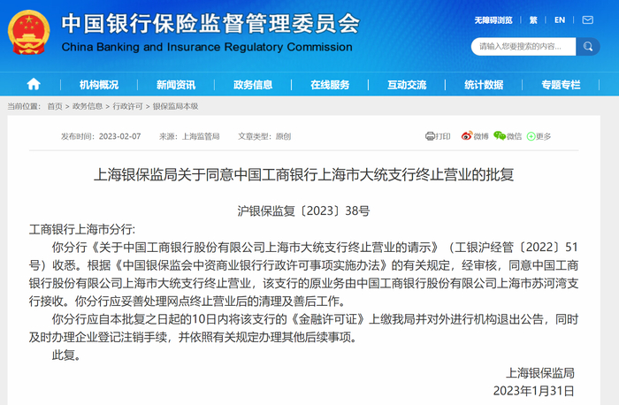 中国银保监会官网2月7日发布的信息显示,工行上海大统支行、工行上海莘庄商务区支行、建行上海胶州路支行、建行上海长海支行四家支行在1月31日获批终止营业。
