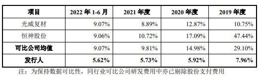 招股书中选取的可比公司为碳纤维生产商,并向预浸料、制品等领域延伸,其针对碳纤维原材料的研发投入较大。而公司主要聚焦碳纤维复合材料制品相关的应用研究,材料费和动力费相比同行业公司较低,导致整体研发费用率相对较低。