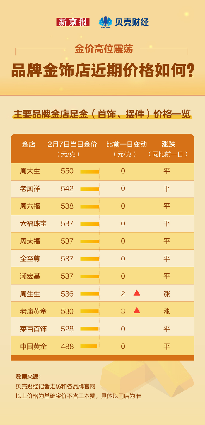 2月7日,贝壳财经记者走访发现,品牌金饰店金价基本在488-550元之间。金价最高的金店是周大生珠宝,当日报价550元/克。