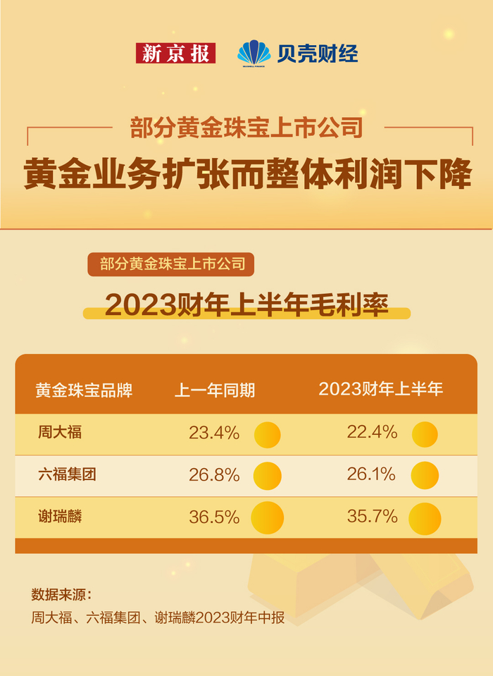 六福集团2023财年中报也称,由于金价下跌带动黄金销售气氛良好,本集团整体毛利率因黄金销售占比增加而轻微下降。谢瑞麟则在2023财年中报也提到,金价下跌致香港黄金产品需求有鼓舞性增长,记者梳理谢瑞麟财报发现,其整体毛利润相比上一个财年也有所下降。这与谢瑞麟中国内地珠宝销售不景气有关。