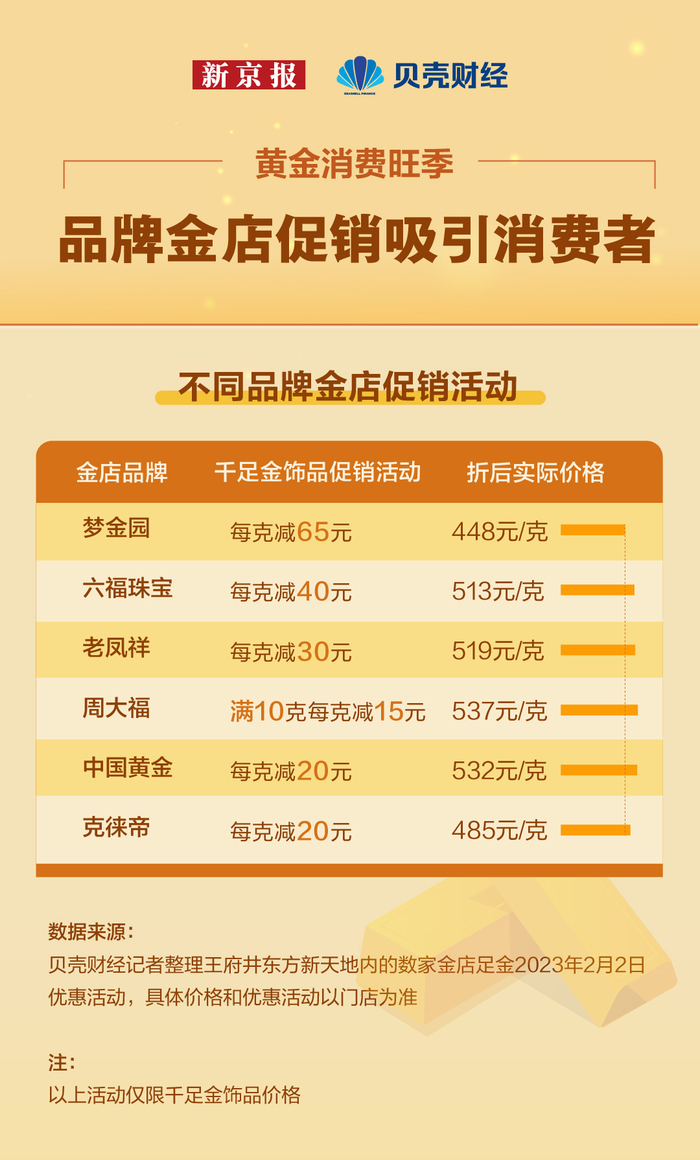2月初,贝壳财经记者走访北京王府井商圈多家金店发现,多家金店报价超过500元/克,但大多有“克减”活动,实际购买价格略有优惠,商家抓住春节期间传统旺季这种消费需求,推出购物满减、购物赠礼、返券等一系列促销活动,吸引黄金消费者进一步增长。