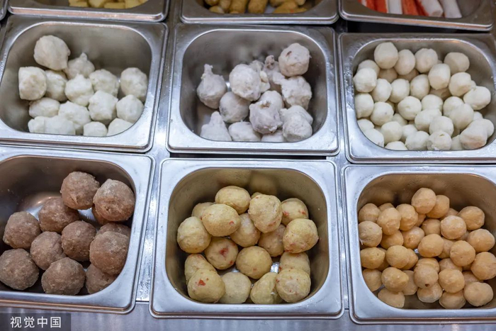 便宜速冻肉丸的口感就是“面坨坨”,淀粉感十足,跟价格较贵、用料扎实的肉丸口感没得比;但你要说它是素的吧,在一些麻辣烫店里,这些丸子又属于“荤菜”一类,往往跟牛肉、鱼肉、鸭肠等同一售价。