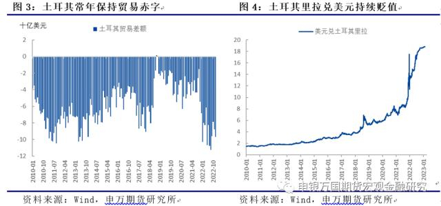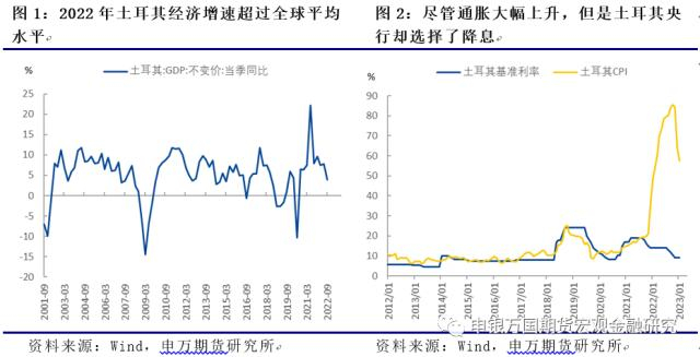 近日土耳其连续发生多次强度较高的地震,对当地居民的生命健康和生产生活带来严重的影响。预计土耳其的经济增长也将受到一定程度的打击。过去两年土耳其经济增长表现尚可,2022年GDP增速达到5.5%,高于全球平均水平。受到供应链问题的影响,过去一段时间土耳其通胀大幅上升,一度超过80%。与大部分国际加息应对通胀相反,土耳其选择了降息。