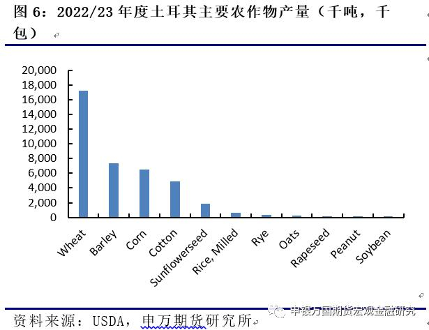 农产品方面,USDA预估22/23年度土耳其粮食等农作物中,小麦、大麦和玉米产量排前三,其中小麦产量达到1725万吨,大麦740万吨,玉米产量达到650万吨。棉花产量达到490万包(480磅一包)。