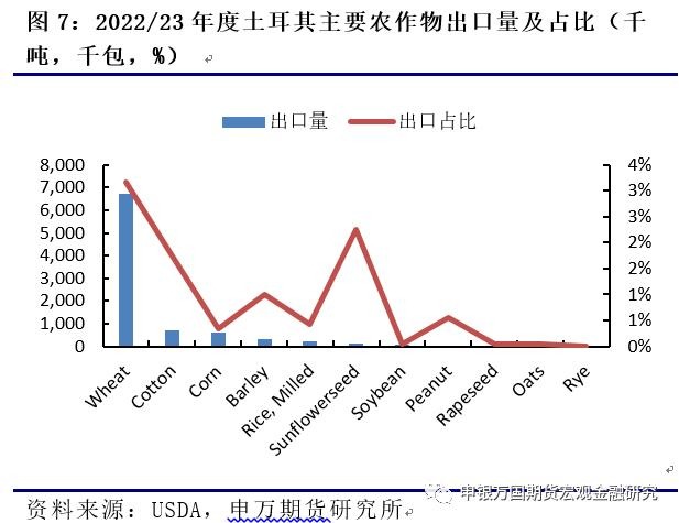 22/23年度土耳其出口最多的是小麦,达到675万吨,占全球出口的3%。其次是棉花70万包(一包480磅),占全球的2%。预计玉米出口60万吨,占比不到1%。此外葵花籽出口12.5万吨,占比全球的2%。因此土耳其粮食等农作物对全球供需影响比较有限。