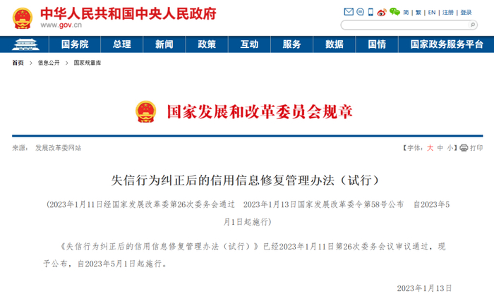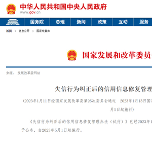 日前,国家发展和改革委员会发布《失信行为纠正后的信用信息修复管理办法(试行)》,该办法自2023年5月1日起施行。