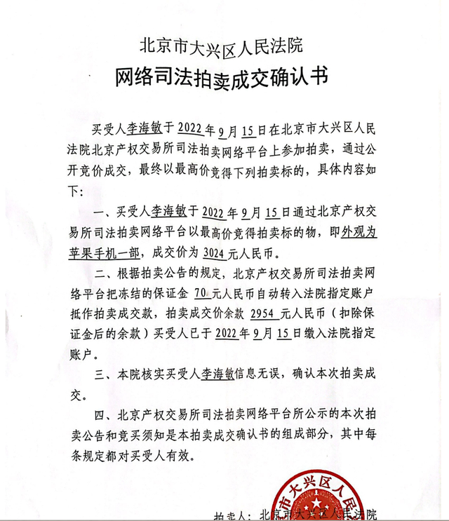 2022年9月15日,拍卖完成后,李海敏收到了由北京市大兴区人民法院开具的《网络司法拍卖成交确认书》,包含此次拍卖的买受双方信息、成交价格等信息。受访者供图