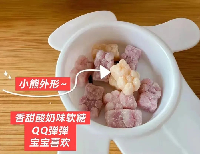 外观也超级可爱,2岁+长牙了的孩子都可以吃。每天1~2颗,Q软甜甜的,满足孩子吃糖的欲望。