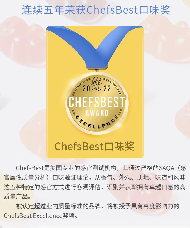 除了科学的配方和丰富的营养外,小熊软糖的水果味道和软软的口感也深受孩子们的喜爱,连续5年拿下美国厨师ChefsBest口味奖!