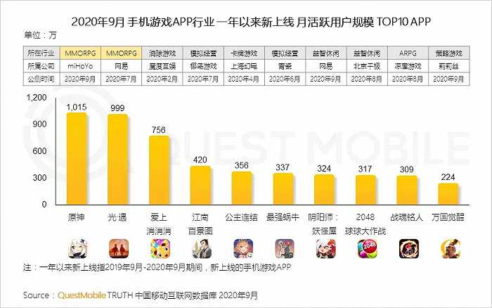 不上部分渠道,不影响这两款精品游戏的MAU。根据QuestMobile发布《2020中国移动互联网秋季大报告》指出,《原神》排名2020年9月新游月活跃用户规模TOP1,而《万国觉醒》也进入前10。
