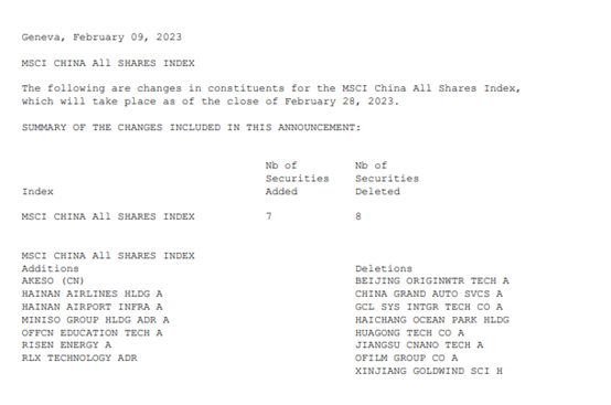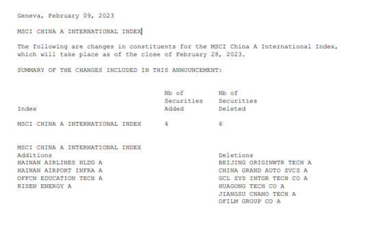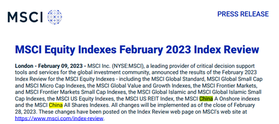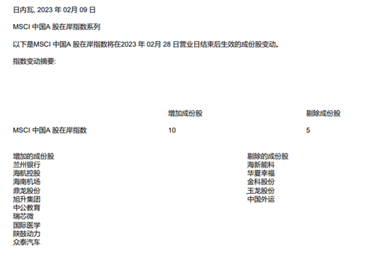 北京时间2月10日,明晟公司(MSCI)宣布季度审核变更结果,包括MSCIA股在岸指数(MSCI China A Onshore indexes)以及MSCI中国全股票指数(MSCI China All Shares Indexes)。所有指数调整将在2月28日生效。